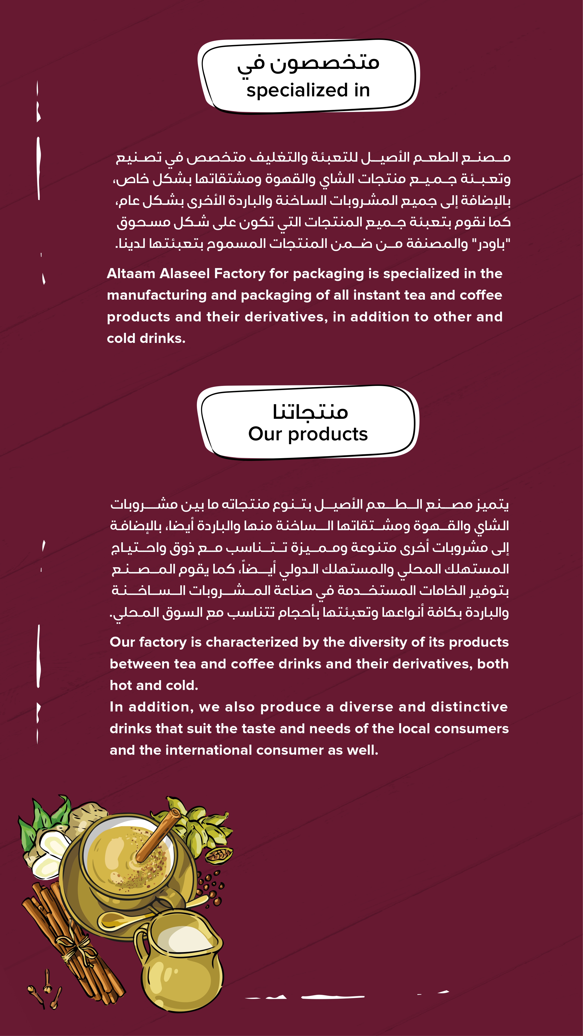 مصنع الطعم الأصيل للتعبئة والتغليف متخصص في تصنيع وتعبئة جميع منتجات الشاي والقهوة ومشتقاتها بشكل خاص، بالإضافة إلى جميع المشروبات الساخنة والباردة.